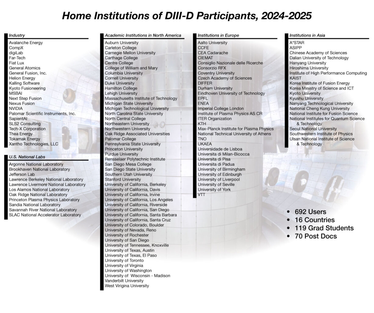The DIII-D research program is open to research proposals from any interested researcher, and it serves as a major hub in the international scientific community. The current DIII-D team comprises 666 users from domestic and international institutions, including U.S. national laboratories, academic institutions, and industry. DIII-D users include a mix of on-site researchers and scientists working remotely at their home institution. New users are regularly being added to the research program at DIII-D – become a new user here.